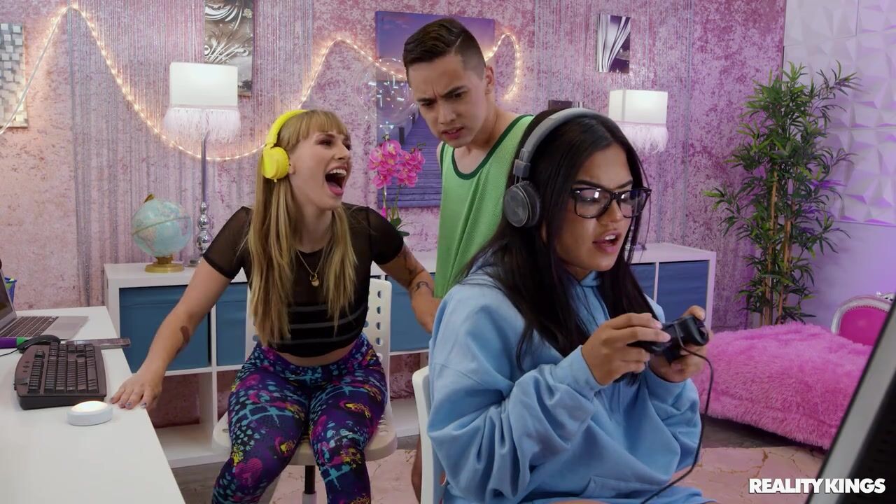 Description: Sexy streamer Angel Youngs is flashing her big tits and playing with her pussy on stream for her fans, right behind her gamer roommate's back. When her roomie's boyfriend Juan Loco comes in to watch his GF game, Angel decides to incorporate him into her show, sucking his big dick on cam and riding it! Juan's gf doesn't notice a thing as Angel's big tits and ass bounce right behind her back! Once she leaves, Juan can really pound Angel's pussy and cum all over her face!