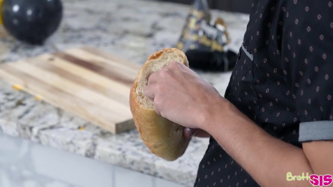 Chloe Temple is looking at dresses to decide which one to wear to a New Year’s party. She asks her stepbrother Ricky Spanish what he thinks. They chat about family traditions on NYE and Chloe winds up telling Ricky he should resolve to grow a pair and he might get laid.Ricky misinterprets what Chloe said she and her mom do and winds up with his dick in some bread. Chloe walks in on him and decides that he might be freaky enough to fuck after all. Deciding to try Ricky out, Chloe hops onto the counter and has him eat her pussy until she’s satisfied he’s worth banging.Spreading her thighs, Chloe invites Ricky to shove his dick inside. She hops off the counter and lets Ricky give it to her from behind. When Ricky lays down, Chloe rides his hardon in cowgirl and then turns around to keep their party going in reverse cowgirl. Once Chloe has sucked Ricky to the point where he cums all over her face, she suggests this can be their new NYE tradition.